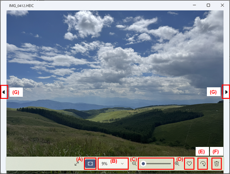 (A) 実際のサイズに拡大/ウインドウに合わせる: ボタンをクリックすると、写真の実際の大きさに拡大して表示します。また、再度ボタンをクリックすると、表示しているウインドウの大きさに合わせて写真を縮小します。