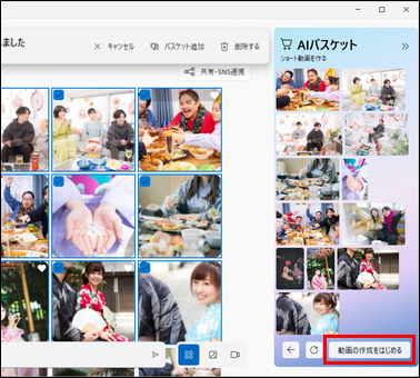 「AIバスケット」に使用したいコンテンツをすべて追加しましたら、「動画の作成をはじめる」ボタンをクリックし、「CyberLink PowerDirector for FMV」アプリを起動します。