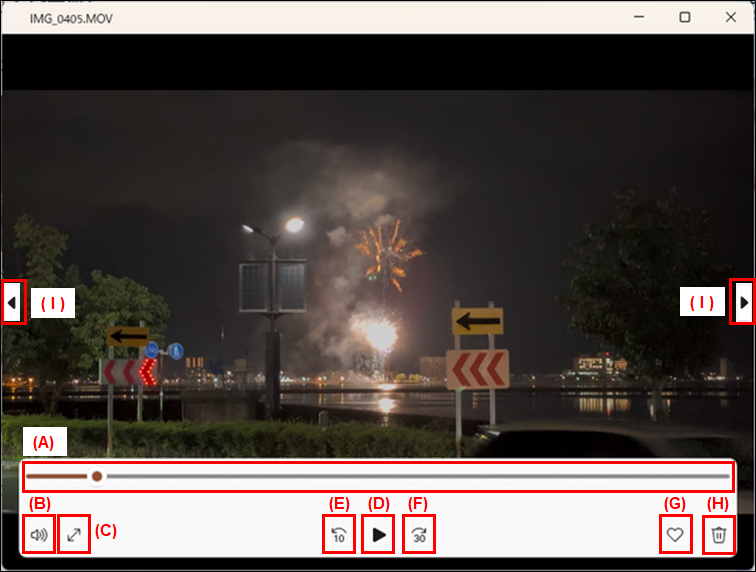 (C) 全画面表示/ウインドウ表示: ビデオの再生を全画面表示/ウインドウ表示で切り替えることができます。